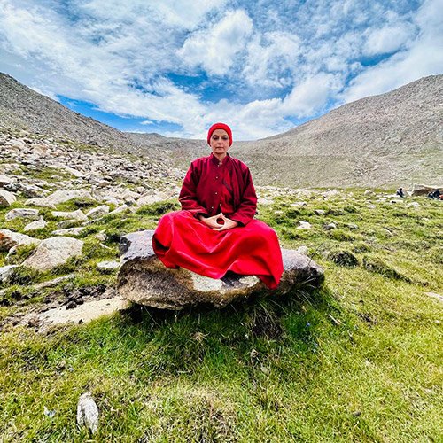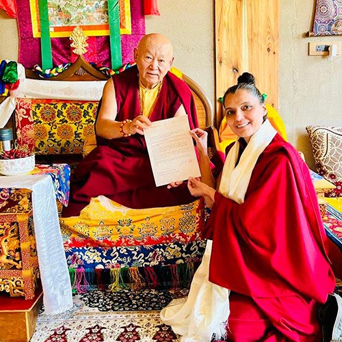 Drupon Gyalten Samten (formerly Barkha Madan), a former model, actress, and producer, began her spiritual journey at the age of 10 with a visit to Rumtek Monastery. A transformative meeting with His Holiness the Dalai Lama in 2001 deepened her connection to Buddhist philosophy and led her to formally pursue the Dharma. In 2012, she renounced her film career and received ordination at Sera Jey Monastery from His Eminence Choden Rinpoche, under the guidance of Venerable Zopa Rinpoche— becoming one of the first non-Himalayan Indian women ordained in the Tibetan Buddhist tradition.
